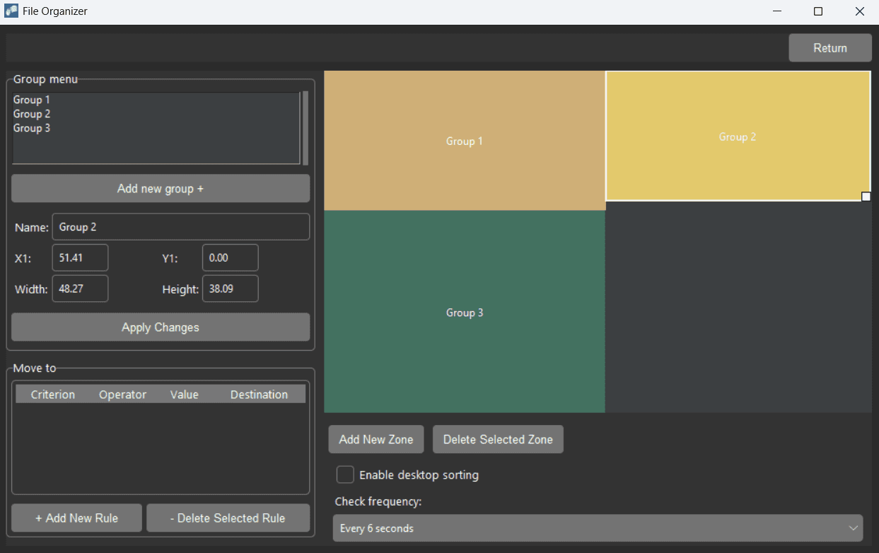 Define desktop zones by visually drawing them or entering coordinates. Configure rules to filter files based on a single attribute – Name, Extension, Size, or Date – and automatically move them to a designated Zone or absolute path. You have full control over the check frequency, with intervals ranging from 6 seconds to 12 hours.