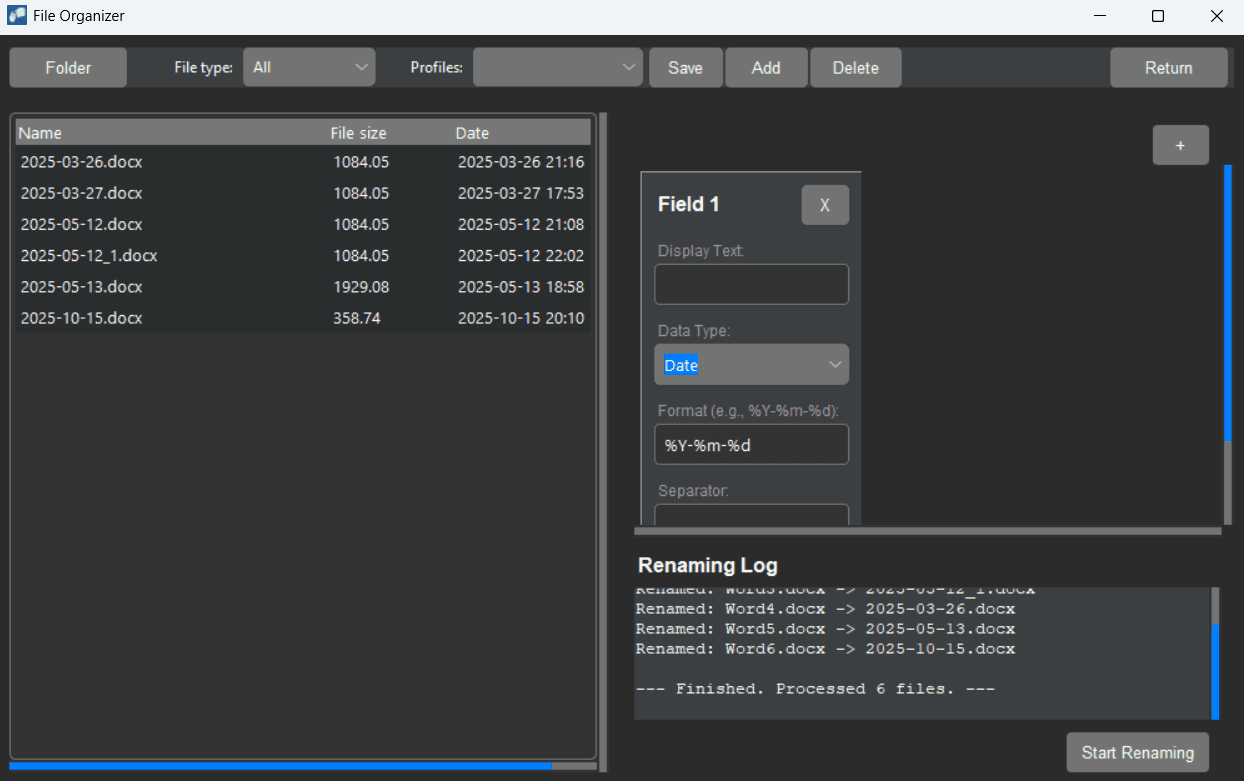Perform bulk renaming of all files in a selected folder. You can construct dynamic filenames by combining multiple fields joined by your preferred separators. For each field, you select exactly one source: Text, Date, Size, or a Metadata Key. The tool offers precise control, allowing you to define specific formats and determine how to handle missing attributes: by skipping the file, using a fallback value, or inserting an empty string. You can save your configuration as a profile for future use.
