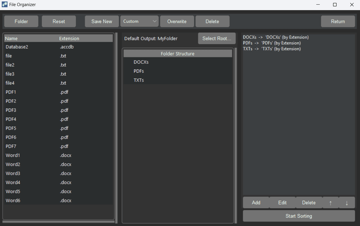 Automatically distribute your files into a custom subfolder structure. The system sorts the selected folder based on your pre-set hierarchy and specific matching rules involving Name, Extension, or Size (MB). You can easily add, modify, or delete these sorting rules at any time. Additionally, you can save your customized hierarchy and settings into separate profiles for easy access.