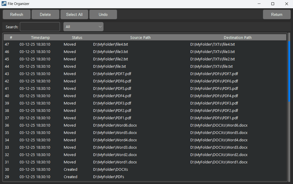 Monitor file system activity in real-time by leveraging the efficiency of the disk's USN Journal. The system tracks four key events: deleted, created, renamed, and moved. You can easily revert changes by undoing single or multiple actions. Additionally, the tool includes a suppression feature to mute folders generating "Event Storms" (rapid bursts of activity occurring in less than 1 second).