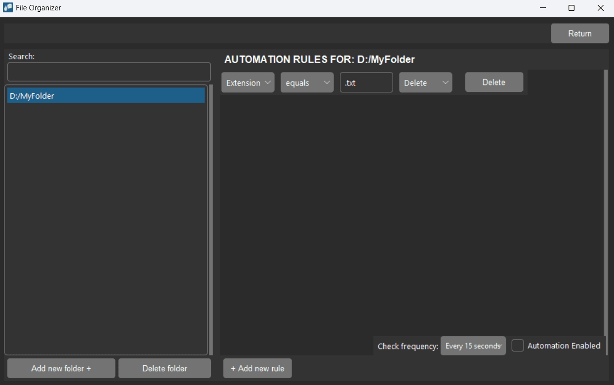 Configure targeted automation for specific folders. You can define multiple independent actions to manage folder contents based on precise criteria. Build rules by selecting an attribute (Extension, Name, Size, or Created (Days)), applying an operator, and setting a target value to trigger a Move, Rename, or Delete operation. You have full control over the monitoring schedule, with scan frequencies ranging from every 15 seconds to once a day.
